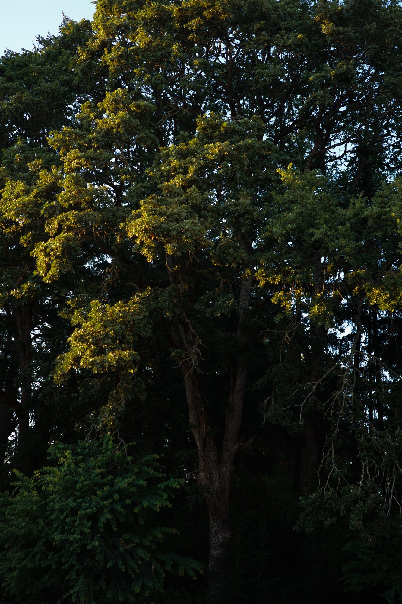 The sun slowly sets as the oak trees leaves across the street deepen into deep blue green shadow.